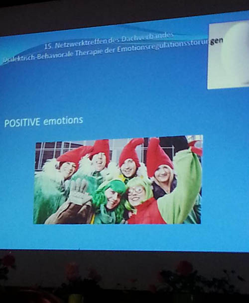 Estas jornadas anuales están lideradas por M. Bohus y un amplio equipo de profesionales especializados en DBT. Reúnen a profesionales de distintas disciplinas: psicólogos, psiquiatras, trabajadores sociales, enfermeros, cuidadores, educadores etc…. que trabajan o están interesados en trabajar desde la DBT. Además de conferencias sobre distintos aspectos de la DBT, se hacen numerosos Workschops (19 en esta edición) para profundizar en las ampliaciones de la DBT o en temas novedosos, como el programa de tratamiento DBT para madres con Trastorno Límite de la Personalidad. El encuentro permite además seguir fortaleciendo la red de trabajo y que los profesionales puedan apoyarse y saber lo que se está haciendo en cada región.